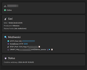 - sprawdzanie portów usług (m.in. HTTP, HTTPS, RTSP)