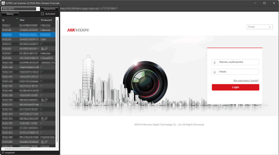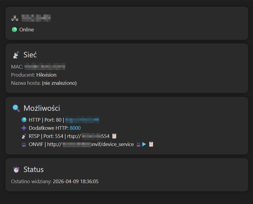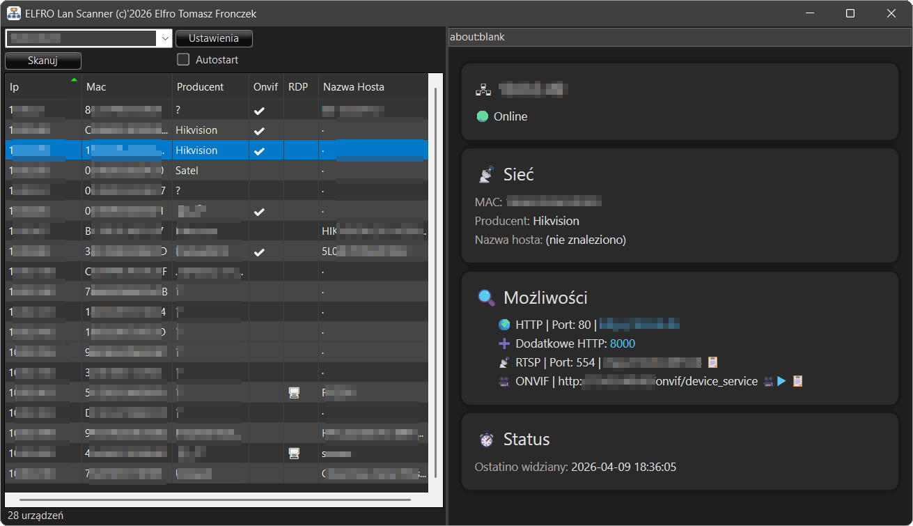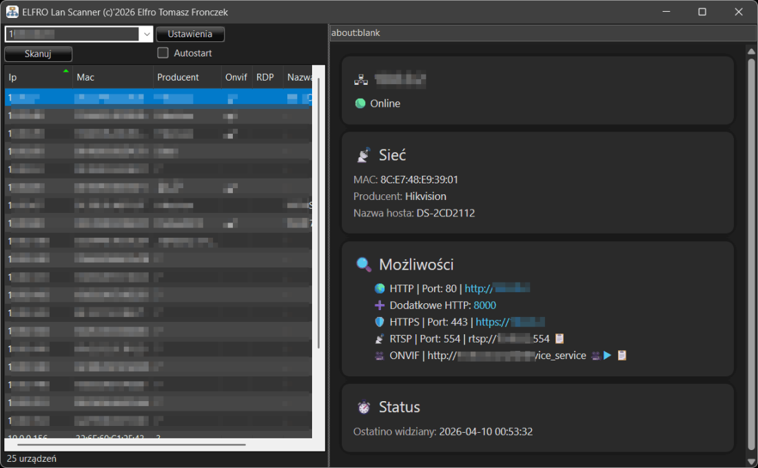 Program automatycznie identyfikuje hosty, porty i technologie (HTTP, RTSP, ONVIF, RDP), a następnie umożliwia natychmiastowy dostęp do urządzeń — bez ręcznej konfiguracji.
