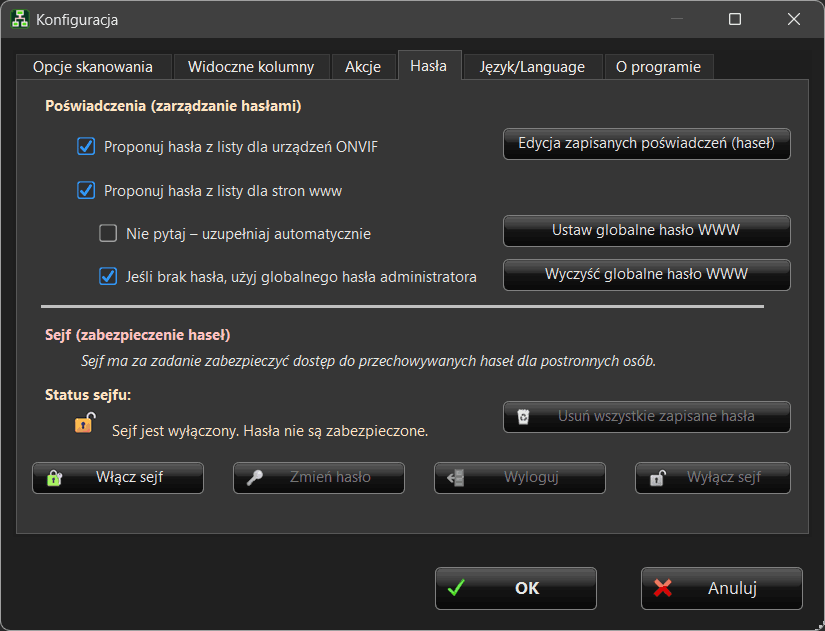 Program Lan Scanner umożliwia zapisywanie i zarządzanie danymi logowania do urządzeń w sieci.