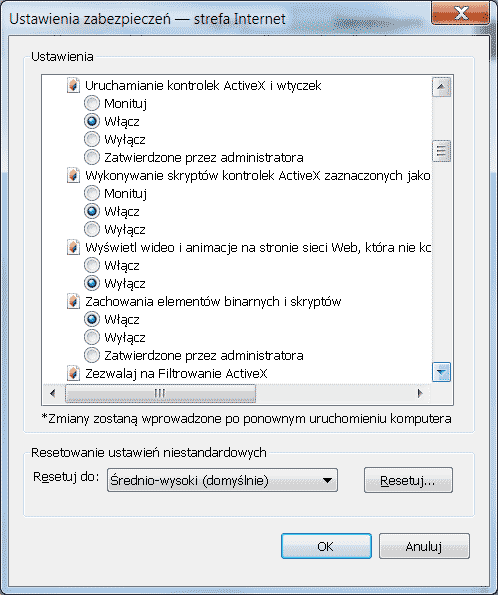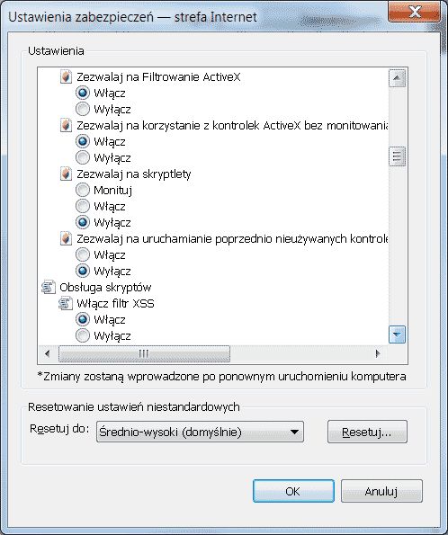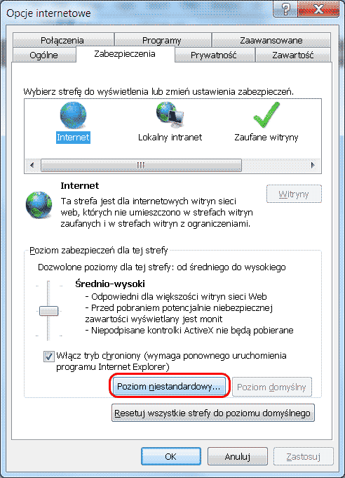w którym klikamy w zakładkę Zabezpieczenia a następnie klikamy w ikonkę Internet