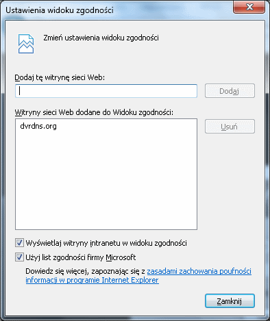 Najnowszy Internet Explorer udaje inne przeglądarki Firefoxa czy Chrome. Aby poprawnie wyświetlić obraz z kamer może być potrzebne ustawienie widoku zgodności.